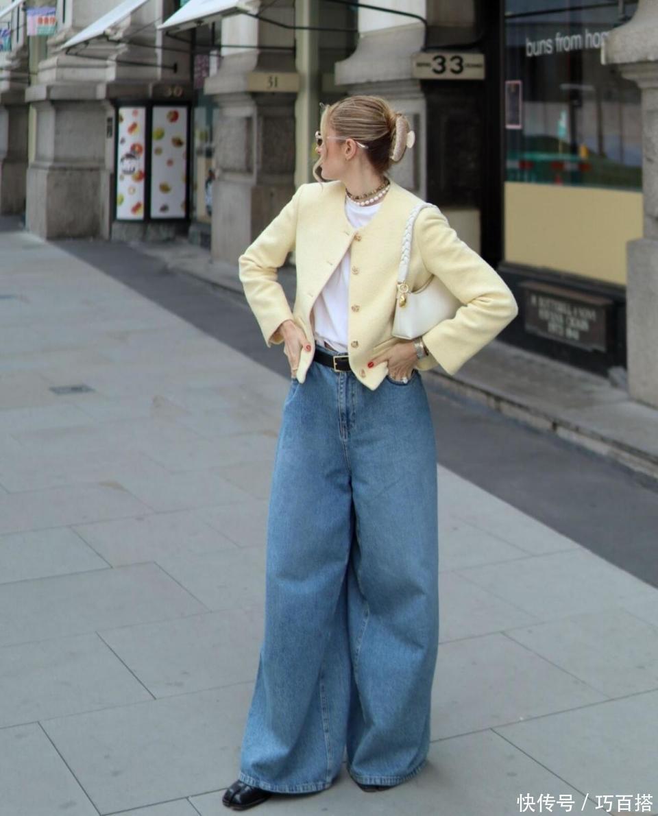 纯白色打底外搭鹅黄色小香风外套,清新文雅,有蓝色阔腿裤、黑色小皮鞋保驾护航,利用上浅下深的颜色分配方式塑造出上轻下重的精致造型,美得得体又耐看。